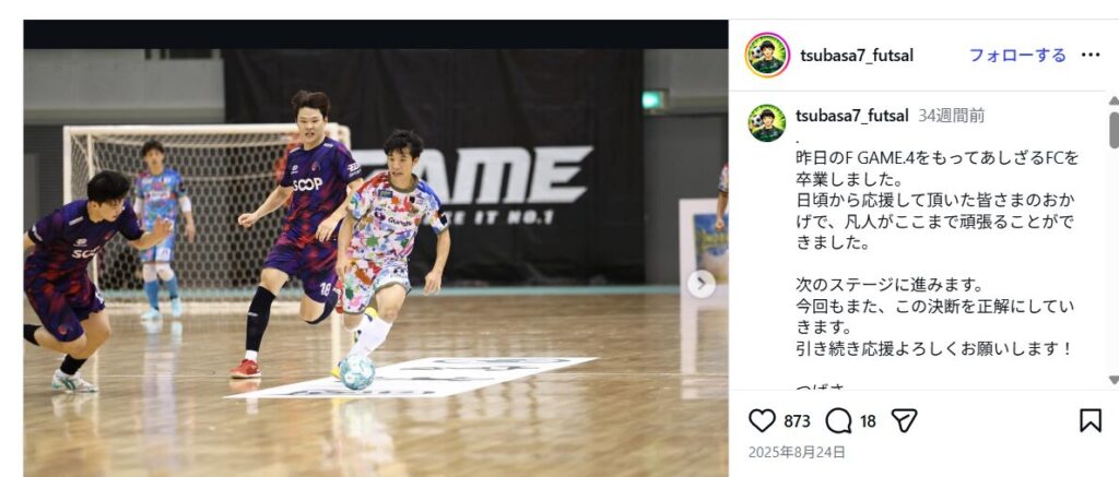 あしざるFCを引退したつばさくんですが、またフットサルに復帰したということで新しいチームに所属されるようです!