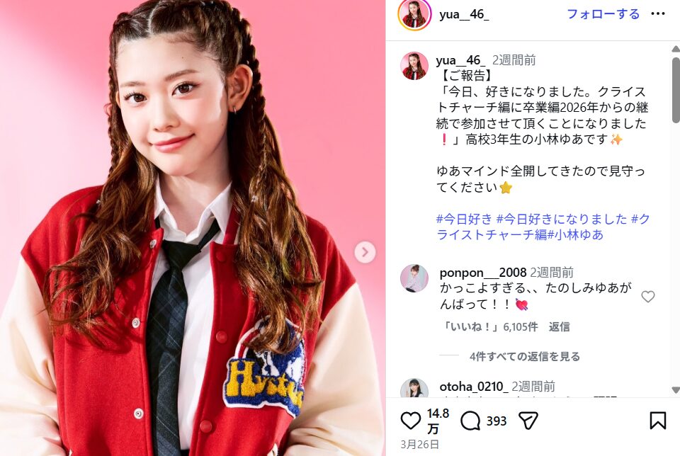 さらに、小林ゆあさんはABEMAの恋愛リアリティ番組「今日、好きになりました。卒業編2026」への出演によって知名度を大きく伸ばしています。