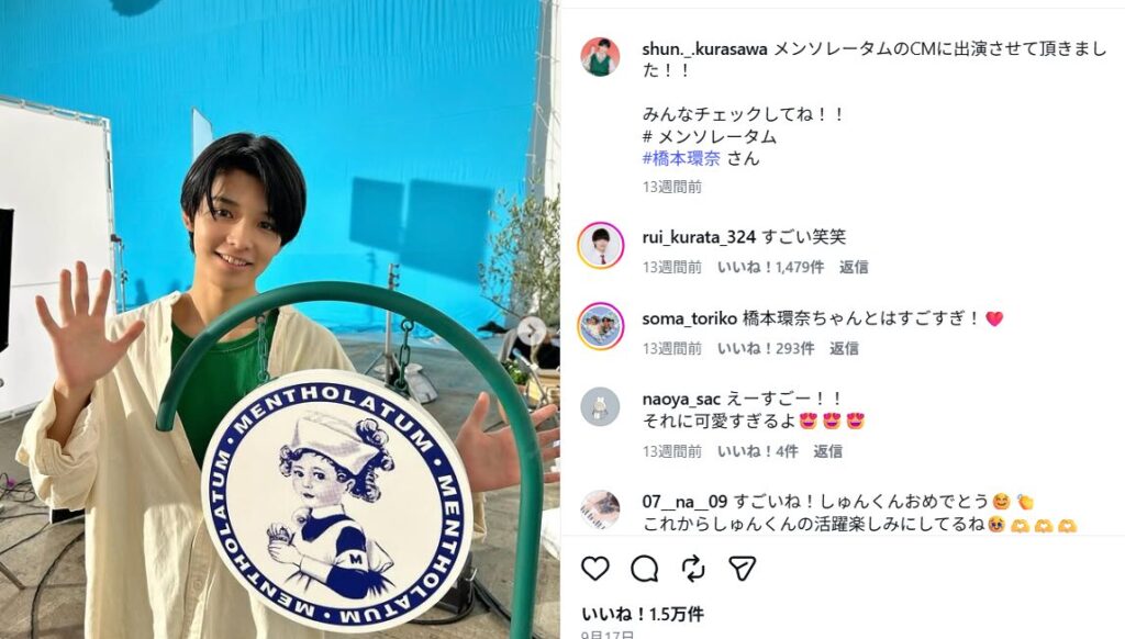 メンソレータムのCMでは橋本環奈さんと共演されたとのこと。