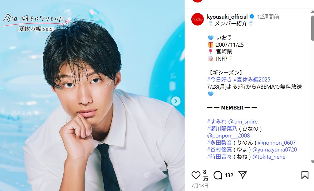 「【今日好き】いおう(榎田一王)」さんが出演しているのは2025年の夏休み編で、初登場ながら高い注目を集め、放送開始直後からSNSでは話題の人物となりました。