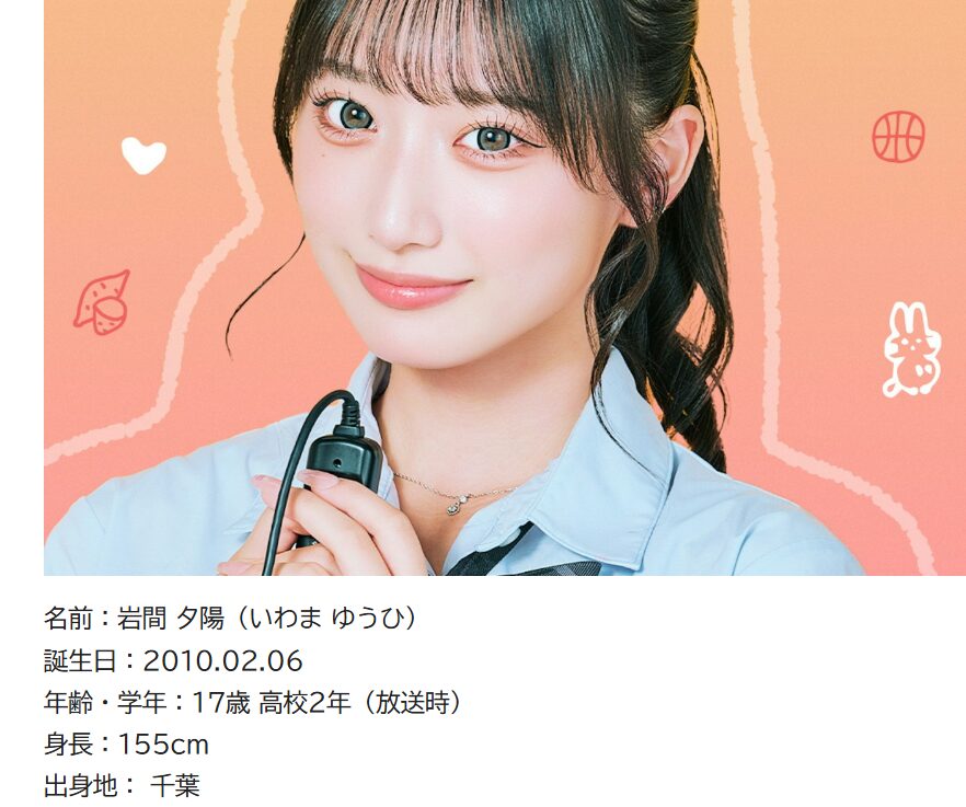2025年10月現在で岩間夕陽は「15歳」で「高校1年生」になります。