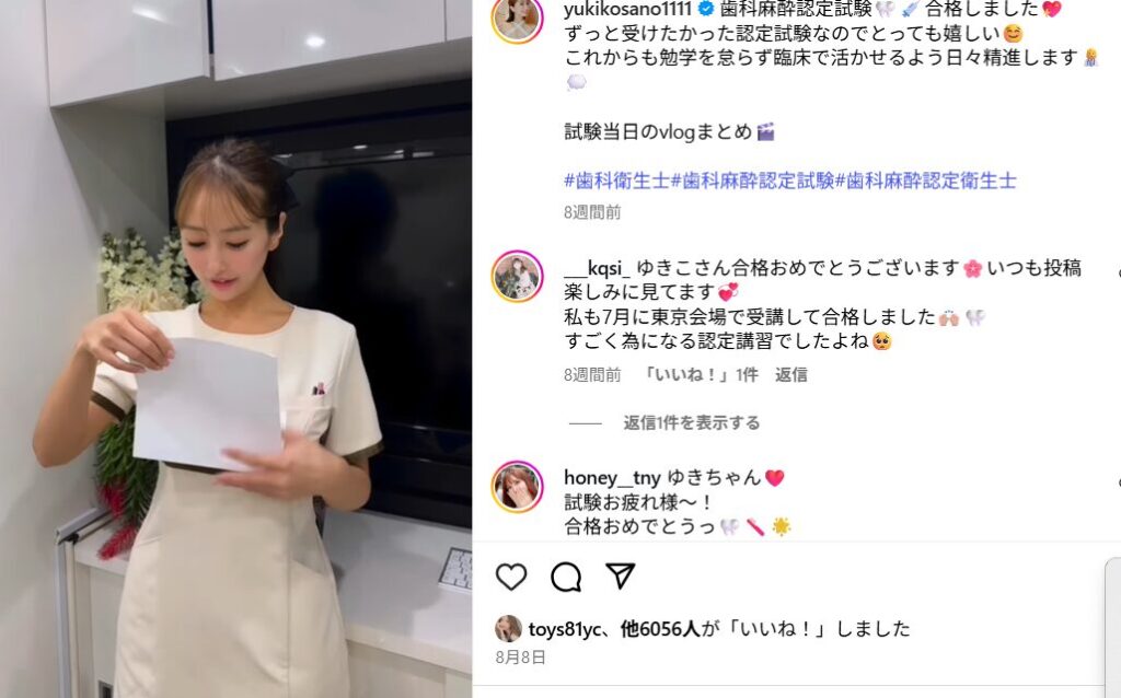 東京医薬専門学校の歯科衛生士科夜間コースに通いながら、インフルエンサー活動との両立を図るというハードなスケジュールをこなし、2017年には見事に国家資格を取得しました。